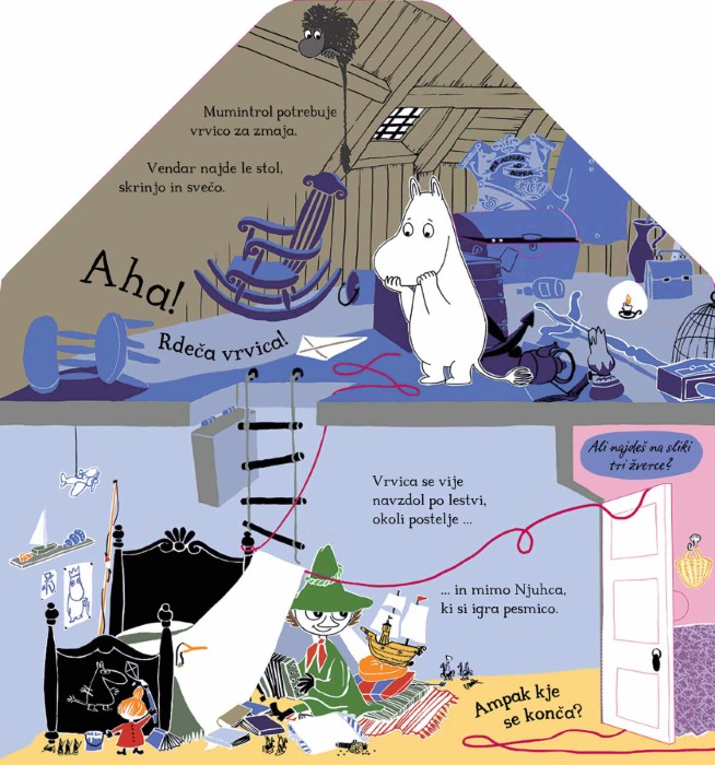 A pustolovščina še ni končana. Vrvica se vije naprej, mimo male Mi, ki se drsa po stopnicah, in otrok hitro začuti, da se v Muminhiši vedno dogaja nekaj novega. Zgodba je nežno humorna, preprosta in hkrati polna domišljije, zaradi česar je popolna za najmlajše poslušalce in radovedne prstke.