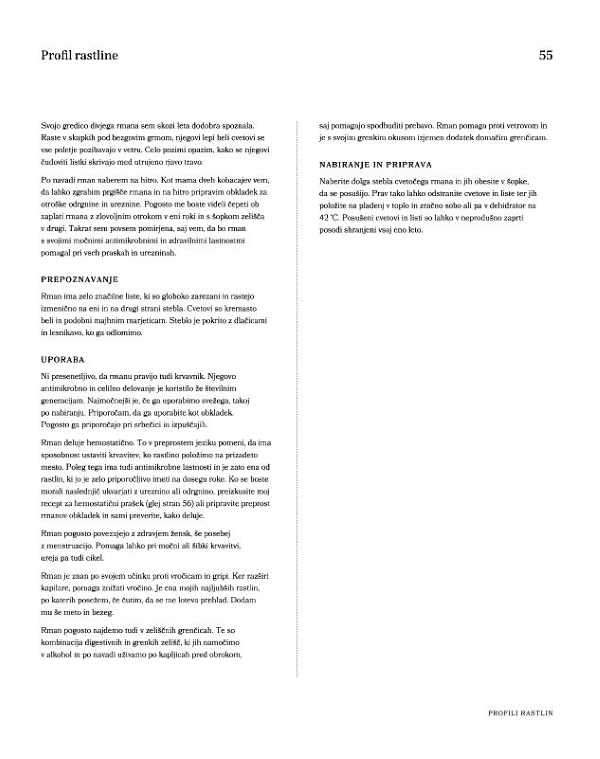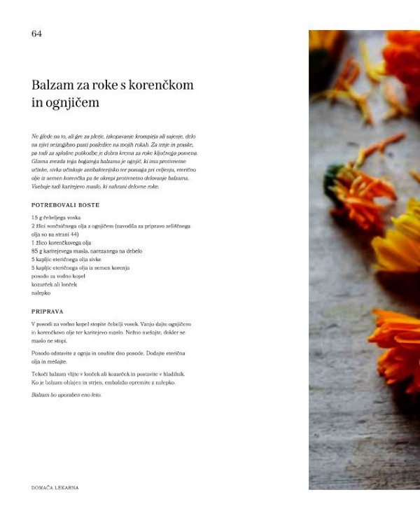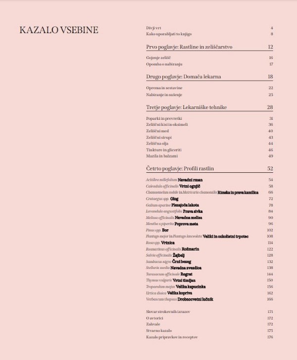 Becky Cole, izkušena zeliščarka, se osredotoča na 20 najpogostejših rastlin, kot so glog, vrtnica, melisa, navadna zvezdica, sivka, trpotec in marjetice. Namesto da bi posegali po sintetičnih izdelkih, vas knjiga uči, kako te rastline prepoznati, jih gojiti, nabirati in uporabljati za krepitev zdravja, nego kože ali celo kulinarične užitke. Knjiga je izjemno praktična, saj vsak korak priprave natančno opiše in ga pospremi s čudovitimi fotografijami, zaradi katerih se boste še bolj zaljubili v svoj vrt.