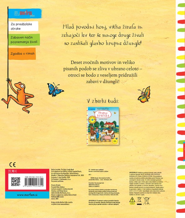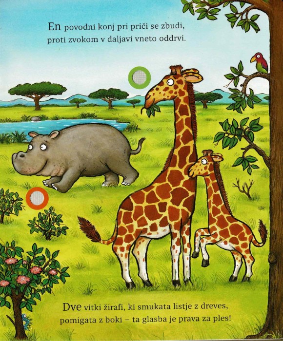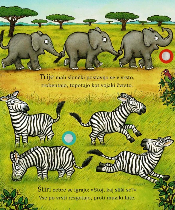 Posebnost slikanice je deset zvočnih gumbov. Ob pritisku otroci slišijo različne zvoke živali in narave.
