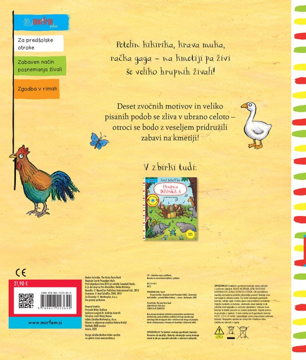 Hrupna kmetija je živahna zvočna slikanica, ki otroke popelje v razigran svet kmetije. Axel Scheffler s svojimi barvitimi ilustracijami ustvari prijazno okolje, kjer se otroci skozi igro učijo, raziskujejo in zabavajo. Besedilo v rimi, ki ga je prepesnil Milan Dekleva, pa poskrbi za prijeten ritem branja.