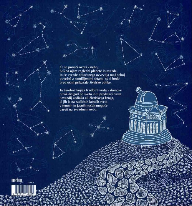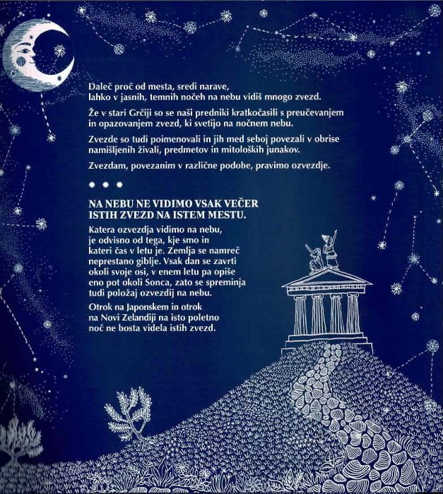 Ko ponoči pogledamo v nebo, vidimo svetle točke, ki pa niso naključne. Knjiga pokaže, kako lahko zvezde povežemo v ozvezdja in v njih prepoznamo različne oblike, pogosto živali.