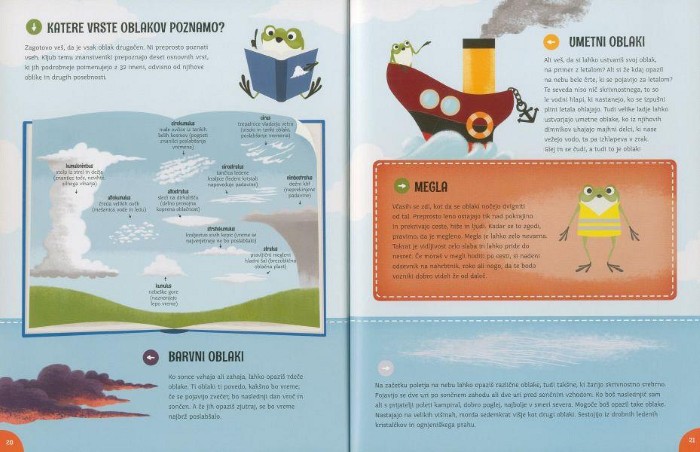 Avtorici zapletene naravne procese razložita na preprost in otrokom razumljiv način. Bralci spoznajo, kako nastajajo oblaki, zakaj pride do padavin in kaj povzroča spremembe vremena. Vsak pojav je razložen jasno, brez zapletenih izrazov, a z dovolj natančnosti, da vzbudi pravo razumevanje.