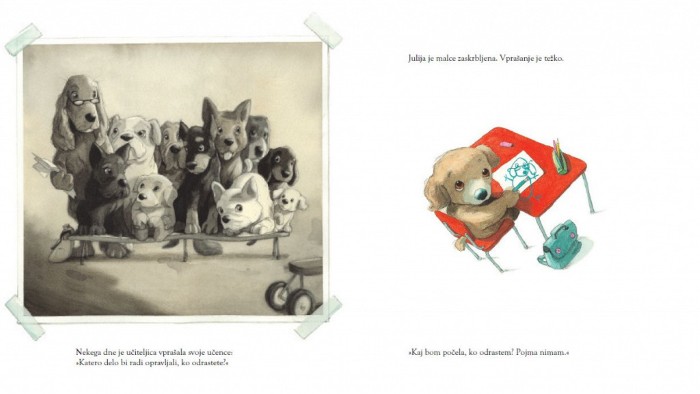 Knjiga je bogato ilustrirana, zato vsaka stran deluje kot povabilo v nov svet. Mehki toni, izraziti obrazi in nežne podrobnosti ustvarijo atmosfero, polno topline in domišljije. Ilustracije razkrivajo sanjske prizore, ki jih otroci opisujejo, in hkrati spremljajo Julietino razmišljanje. Vizualna pripoved daje zgodbi še večjo globino in otrokom pomaga razumeti, da je prihodnost nekaj, kar raste skupaj z njimi.