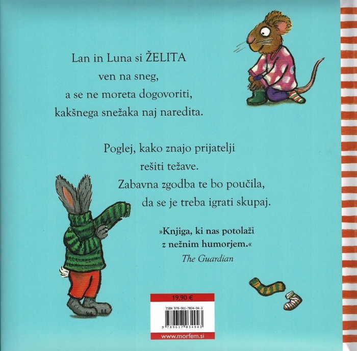 Lan in Luna: Dan na snegu nas popelje v zimsko idilo, polno veselja, snega in otroškega navdušenja. Lan in Luna si zelo želita ven na sneg. A ko pride čas za igro, se zaplete. Ne moreta se dogovoriti, kakšnega snežaka bi naredila. Vsak ima svojo idejo, oba sta prepričana, da je prav njegova najboljša.