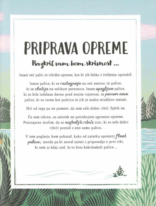 • Pravila in spoštovanje narave: napotki, kako skrbeti za okolje, ravnati z ribami in biti odgovoren član ribiške skupnosti.