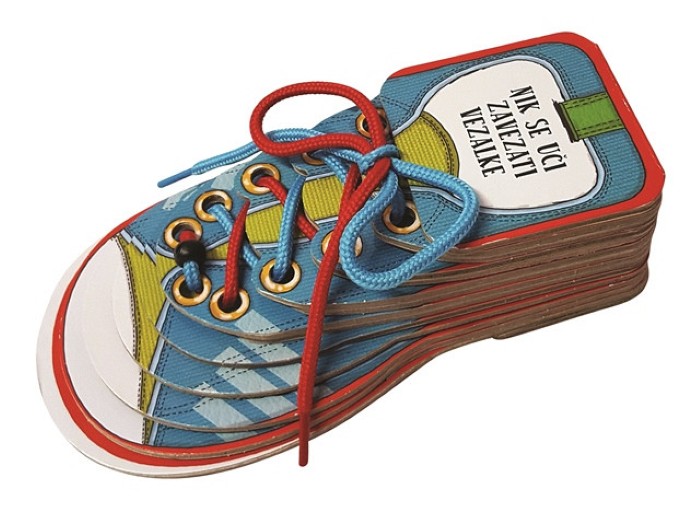 Nik se uči zavezati vezalke je kartonka, kjer otrok vadi zavezovanje vezalk kar na knjižici.