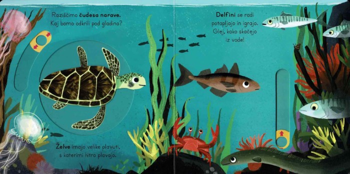 Ilustracije so mehke, barvite in polne detajlov, ki bodo otroke pritegnile k ogledu strani. Vsaka podoba je priložnost za pogovor med starši in otroki: koliko školjk je na plaži, kateri val je večji, katere barve ima rakovica. Ob morju spodbuja opazovanje, primerjanje in raziskovanje skozi igro.