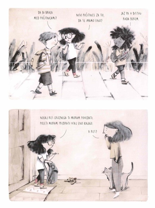 Zgodba jo začne vleči vase. Strani se obračajo hitreje. Besede se spreminjajo v slike, dogodivščine in čarobne kraje.