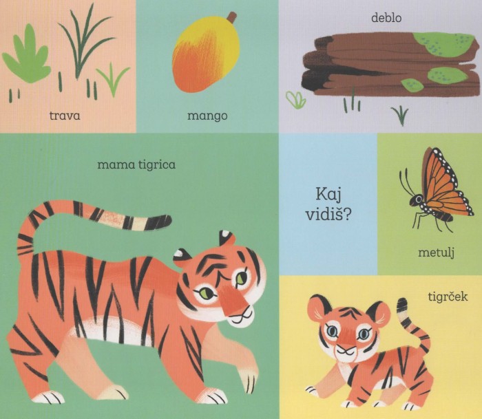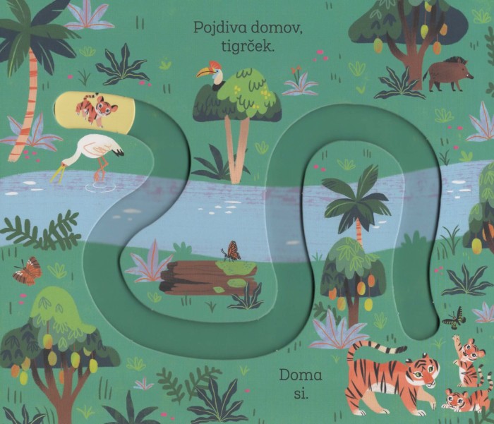 Kartonka Pojdiva domov, Tigrček otroke povabi, da skupaj z malim tigrom raziskujejo pot domov. Ob srečevanju novih prijateljev se naučijo, kaj pomeni pomoč, prijateljstvo in skupna igra. Zgodba je preprosta, a polna topline, zato je idealna za branje pred spanjem ali za kratke trenutke čez dan.