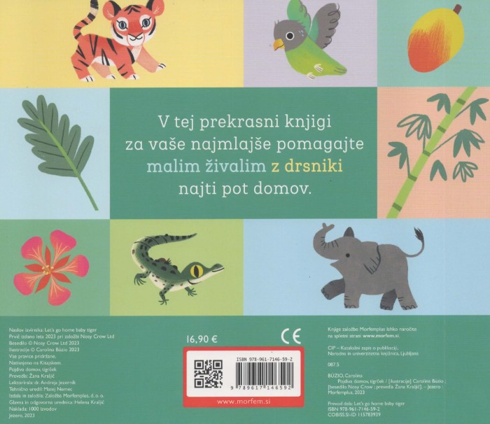 Pojdiva domov, Tigrček je prikupna in igriva kartonka, ki je namenjena najmlajšim otrokom, ki šele odkrivajo svet okrog sebe. Avtorica in ilustratorka Carolina Búzio je ustvarila toplo zgodbo o malem tigrčku, ki se odpravi na pot domov. Na poti ga spremljajo različne živali, barvite podobe in drobne pustolovščine, ki otrokom približajo prve izkušnje z zgodbo, knjigo in spoznavanjem okolja. Zaradi trpežnih kartonastih strani je knjiga popolna za majhne otroške ročice, ki jo bodo z veseljem znova in znova listale.