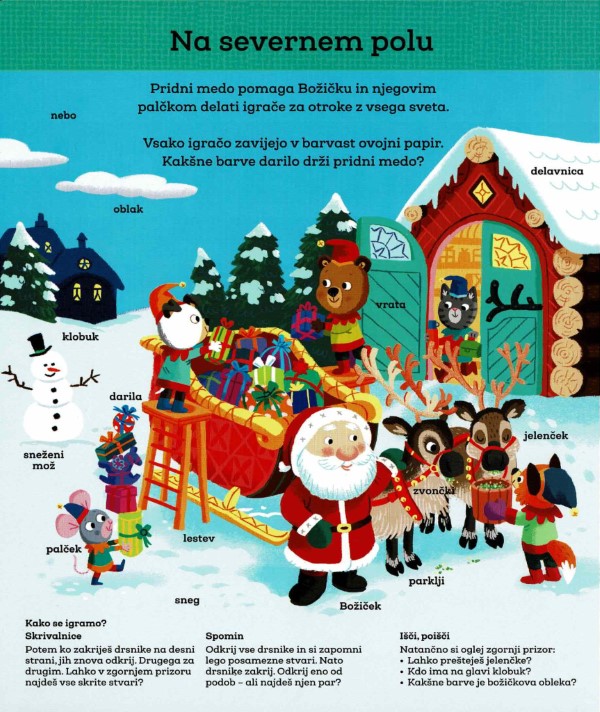 Prikupna interaktivna kartonka, ki malčkom prinaša praznično vzdušje in ob tem spodbuja razvoj spomina ter opazovanja. Avtor in ilustrator Benji Davies, znan po toplih otroških knjigah, je ustvaril preprosto, a igrivo knjigo, s katero se bodo otroci ob branju in raziskovanju zabavali ter učili. Knjiga je izdelana iz trpežnega kartona, zato je primerna za male ročice, ki komaj začenjajo svojo knjižno pot.