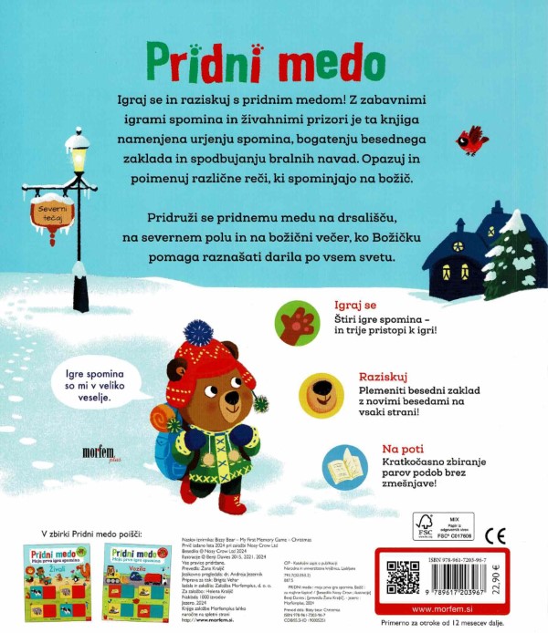 Kartonka otrokom približa praznični čas skozi tople ilustracije in simpatičnega medvedka. Pridni medo: Moja prva igra spomina – Božič malčkom pokaže božične motive – darila, drevesce, snežinke in praznične okraske. Otroci ob tem spoznavajo simbole praznikov, razvijajo domišljijo in uživajo v prijetnem prazničnem vzdušju.