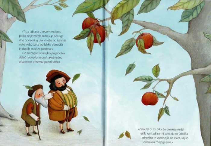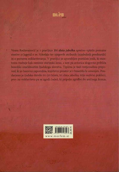 Vesna Radanovič je v pravljici Tri zlata jabolk spretno vpletla poznane motive iz legend o sv. Nikolaju ter njegovih atributih (simbolnih predmetih) in o pomenu miklavževanja. V pravljici je uporabljen poetičen jezik, ki mestoma vsebuje kak zanimiv starinski izraz, s tem pa avtorica slogovno približa besedilo značilnostim ljudskega slovstva. Tipična je tudi tretjeosebna pripoved, ki je časovno zaporedna, književni prostor je v besedilu le omenjen. Poudarjeno je ljudsko število tri (tri hčere, tri zlata jabolka, trije različni poklici), prav na miklavževo pa se zgodi čudež, ki pripelje zgodbo do srečnega konca.