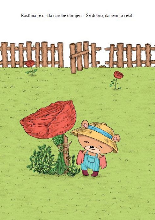 »Zakaj nočeš cveteti?« se sprašuje mali vrtnar. Njegova skrb je iskrena, a rastlina ostaja nespremenjena. Medved ne razume, zakaj se kljub vsemu trudu nič ne zgodi.