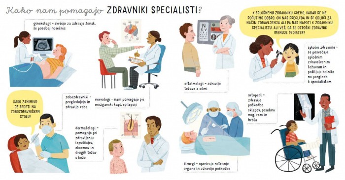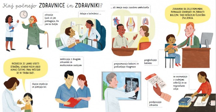 Kartonka razloži, da se zdravniki učijo vse življenje in da je za zdravljenje ljudi potrebno veliko znanja o telesu. Otroci ob ilustracijah odkrijejo, kako srčno in hkrati zahtevno je to delo.