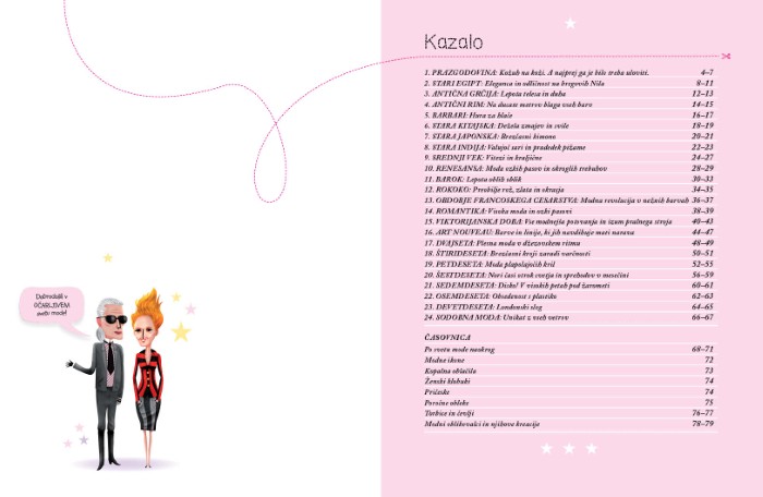 Knjiga predstavi prepoznavne stile iz različnih obdobij. Otroci se srečajo z razkošnimi oblekami renesanse, z dramatičnimi kroji iz baroka, z nežnimi silhuetami 19. stoletja in z drznimi eksperimenti 20. stoletja. Elegantni klobuki, dolge krinoline, prvi modni oblikovalci in priljubljeni dodatki se prepletajo v pripovedi, ki bralce popelje v dobo, ko je vsak element oblačila nosil poseben pomen. Knjiga pri tem poudarja, da se moda nenehno vrača in da ideje, ki so bile priljubljene nekoč, z novimi pristopi pogosto ponovno zasijejo.