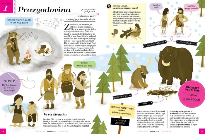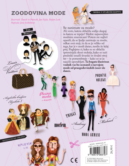 Zgodovina mode je knjiga, ki otroke povabi v živahen svet oblačil, krojev in oblikovanja. Že v uvodnih straneh radovednim bralcem razkrije, kako se je človek oblačil od prazgodovine do današnjega dne. Knjiga združuje zgodovinska dejstva, domišljijo in barvite ilustracije, zato pomaga otrokom razumeti, da obleka ni le kos tkanine, temveč odsev časa, kulture in načina življenja.